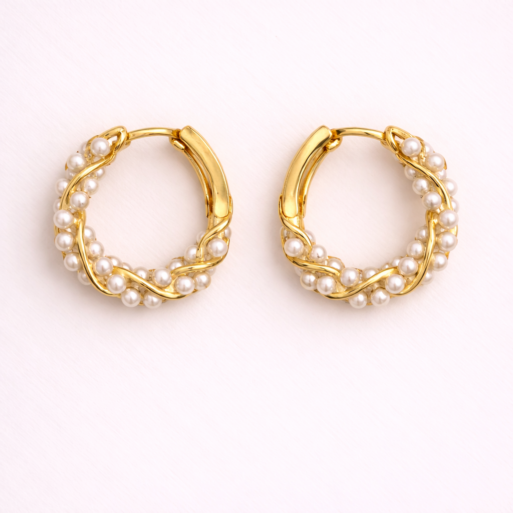 Delicate pearl hoop earrings designed with a soft intertwined silhouette that blends classic elegance with contemporary refinement. The fine arrangement of pearls follows the curve of the hoop, creating subtle texture and gentle movement while maintaining a clean, minimalist aesthetic.