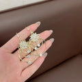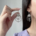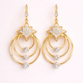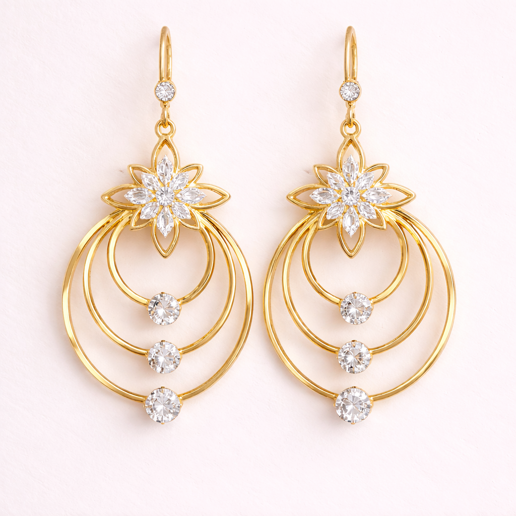These statement drop earrings combine delicate floral details with luminous gold-toned hoops, creating a design that feels both expressive and refined. The layered circular structure introduces graceful movement, while the zirconia accents capture light with a soft, radiant brilliance.