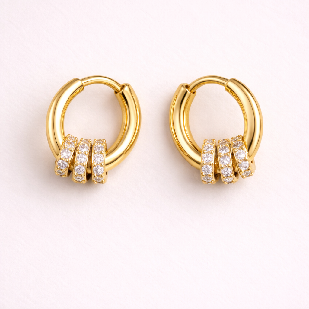 Refined hoop earrings designed with delicate zirconia accents that add subtle brilliance to a timeless silhouette. The polished gold finish enhances the clean circular form, while the layered crystal detail introduces a modern touch without compromising elegance.