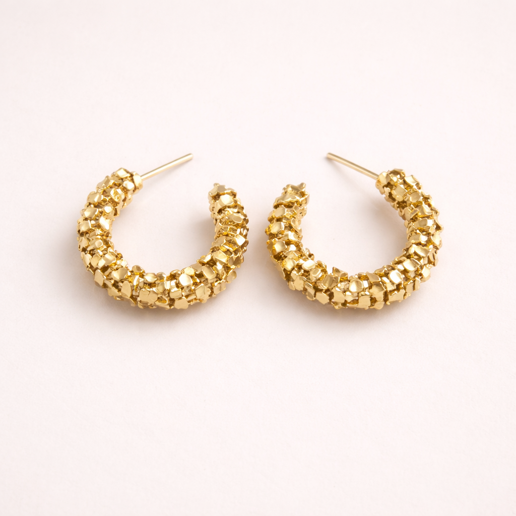 This earring features an irregular design that captures light in a distinctive way, subtly enhancing the natural elegance of the face. Finished in noble metal plating, it offers lasting brilliance and durability, maintaining its beauty through everyday wear.