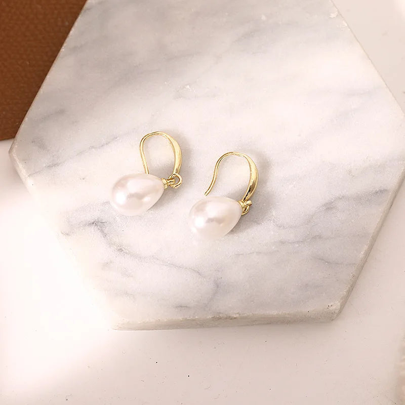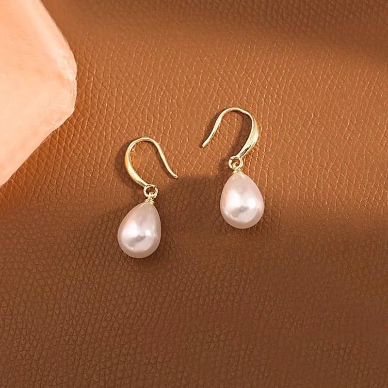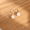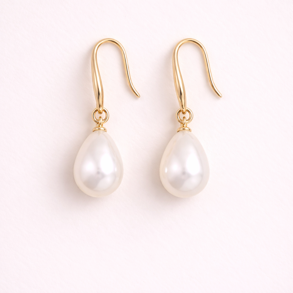 Delicate drop earrings designed to express refined elegance through simplicity. The elongated silhouette highlights a luminous teardrop pearl, suspended from a slim gold-plated hook that moves subtly with every gesture.