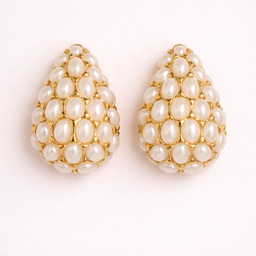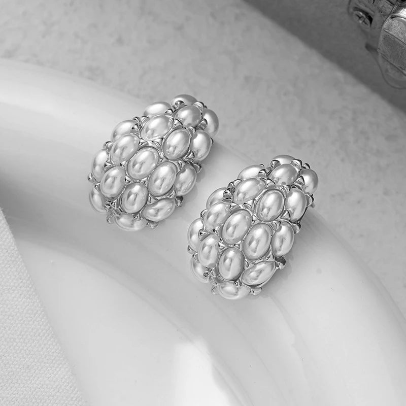 Statement earrings crafted with a sculptural silhouette and delicately arranged pearls that create texture, luminosity and refined dimension. The structured oval shape brings presence to the look while maintaining an elegant and balanced aesthetic.