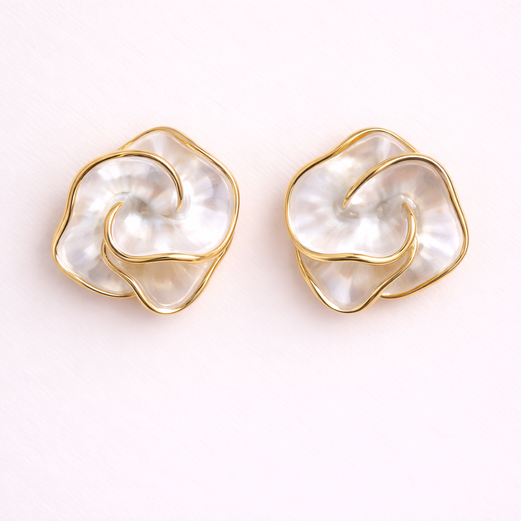 A sculptural floral earring designed to capture light with quiet sophistication. Its organic, petal-like form features a luminous pearl-effect surface framed by refined gold contours. Slender gold threads pass gracefully between each element, creating subtle depth and a sense of fluid movement without excess. The result is modern, elegant, and effortlessly wearable.