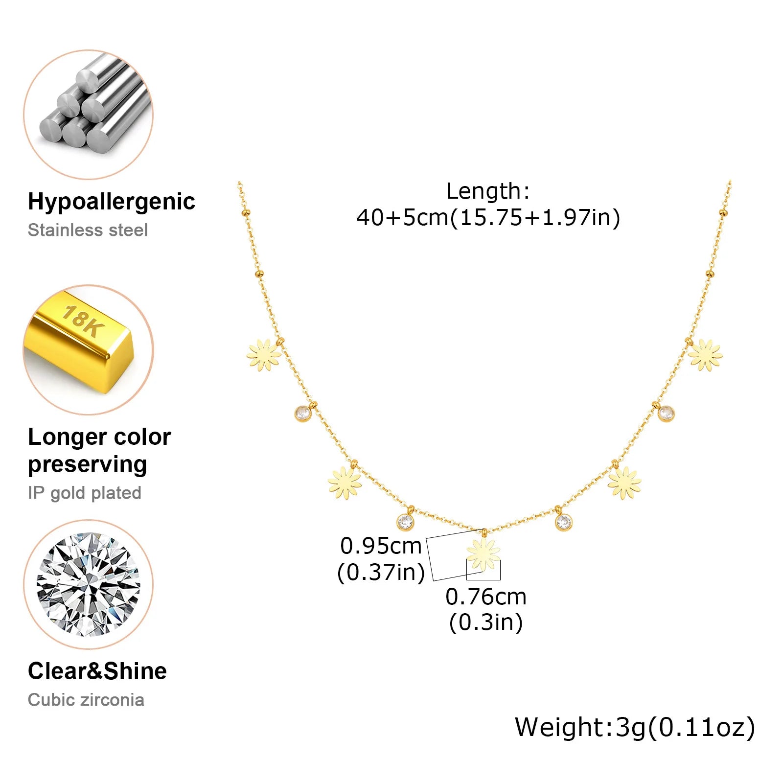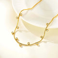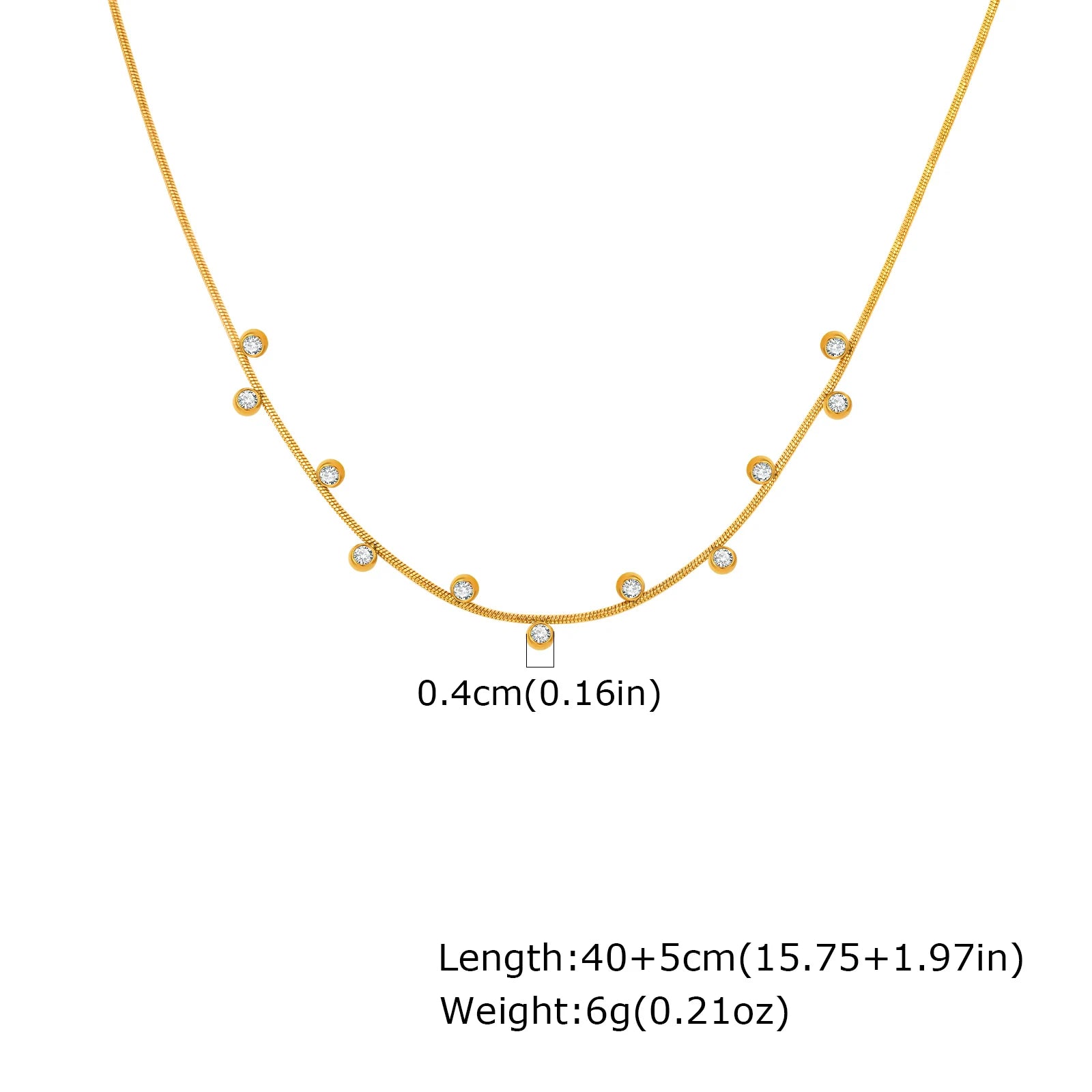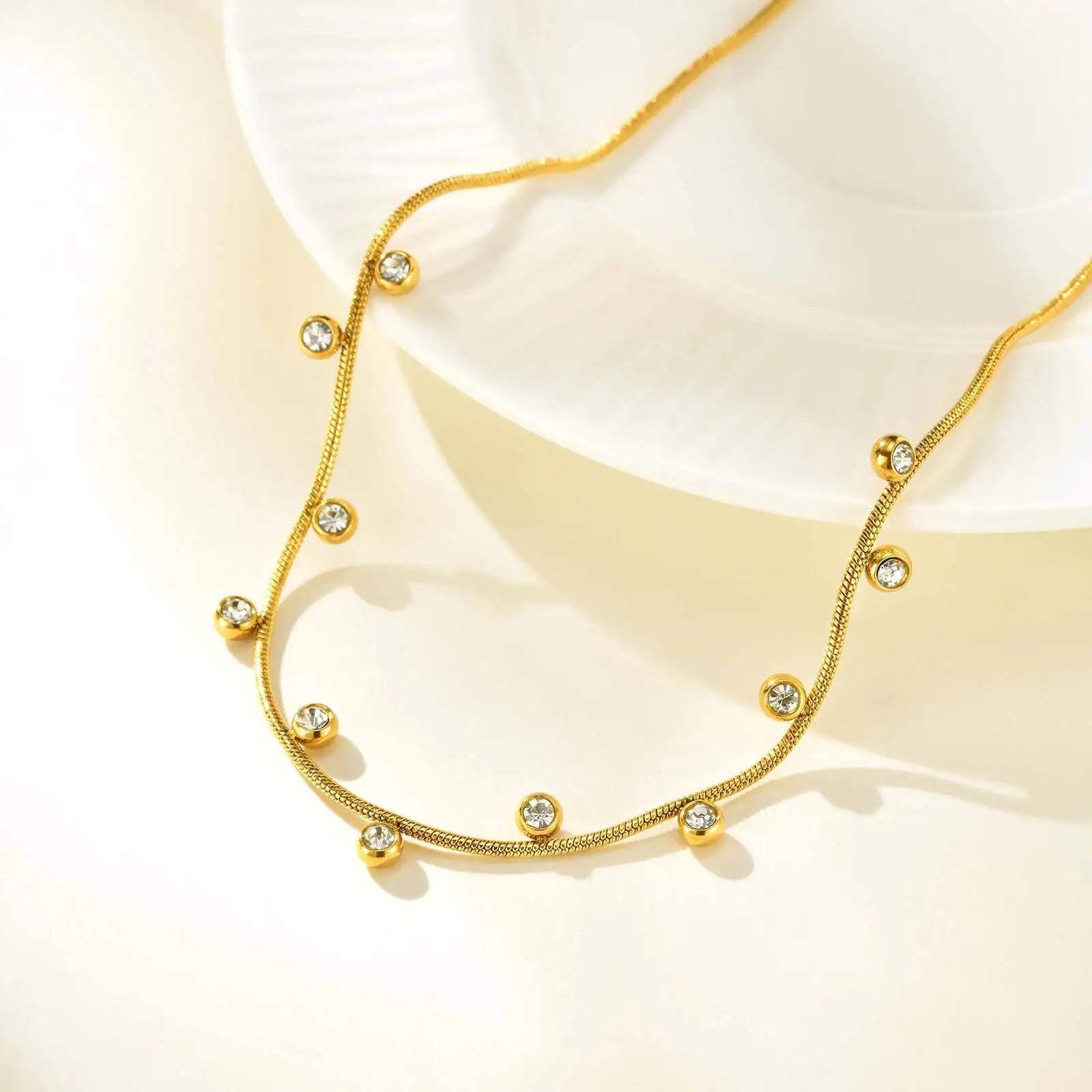 A refined necklace designed with delicate suspended accents that capture light with subtle brilliance. The slim chain follows the natural curve of the neckline, while evenly spaced luminous stones introduce a soft rhythm and modern elegance. Its minimalist silhouette creates a graceful balance between simplicity and detail, making it an effortless piece for layering or wearing alone.