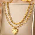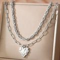 Bold yet refined, this layered chain necklace introduces a modern sculptural presence through its textured heart pendant. The dual-chain composition creates natural dimension across the neckline, combining structured links with a fluid organic centerpiece that reflects light with subtle depth.