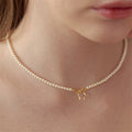 Delicate pearl choker necklace featuring a refined strand of luminous pearls finished with a subtle bow-shaped pendant crafted in 18k gold. The minimal silhouette sits gracefully along the neckline, blending classic femininity with a contemporary, softly romantic presence.