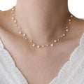 Delicate pearl necklace designed with a refined layered silhouette, where luminous pearls are spaced along a fine gold chain to create lightness, movement, and understated elegance. The balanced arrangement enhances the neckline with a subtle glow, blending classic inspiration with a contemporary minimalist aesthetic.