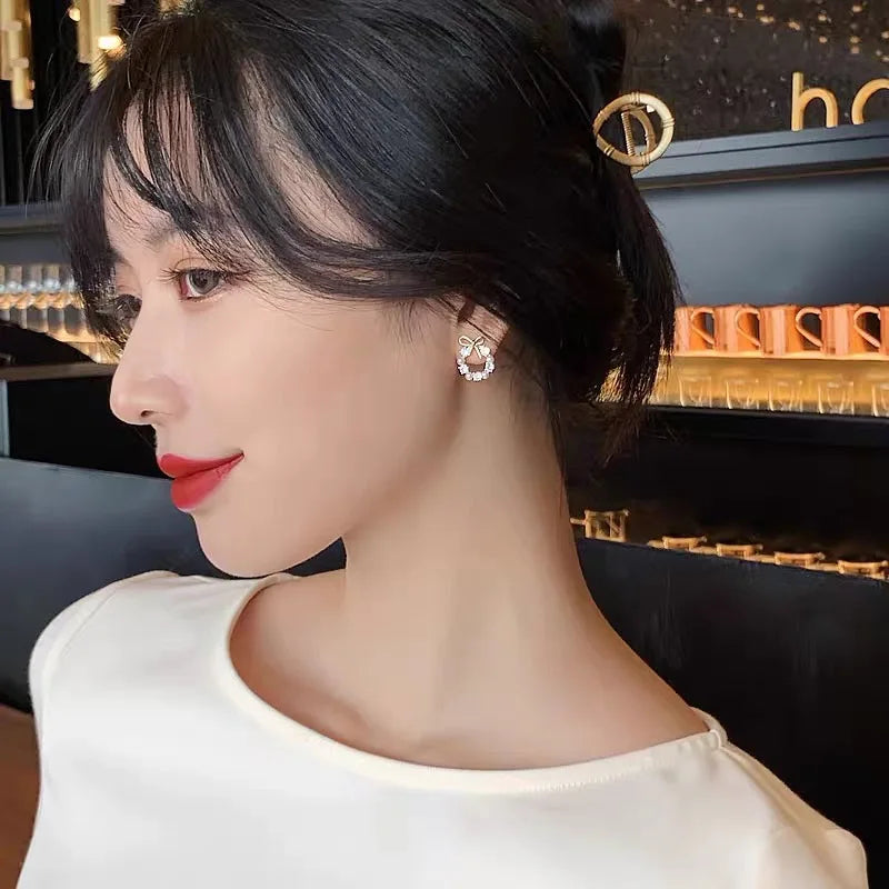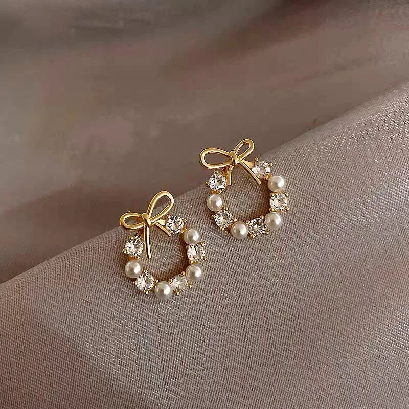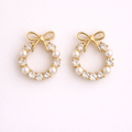 Bow-accent hoop earrings featuring a delicate wreath silhouette that blends romantic elegance with contemporary refinement. The circular design is adorned with luminous zirconia stones and soft pearl accents, creating a graceful balance between brilliance and subtle femininity while maintaining a clean, minimalist aesthetic.