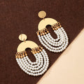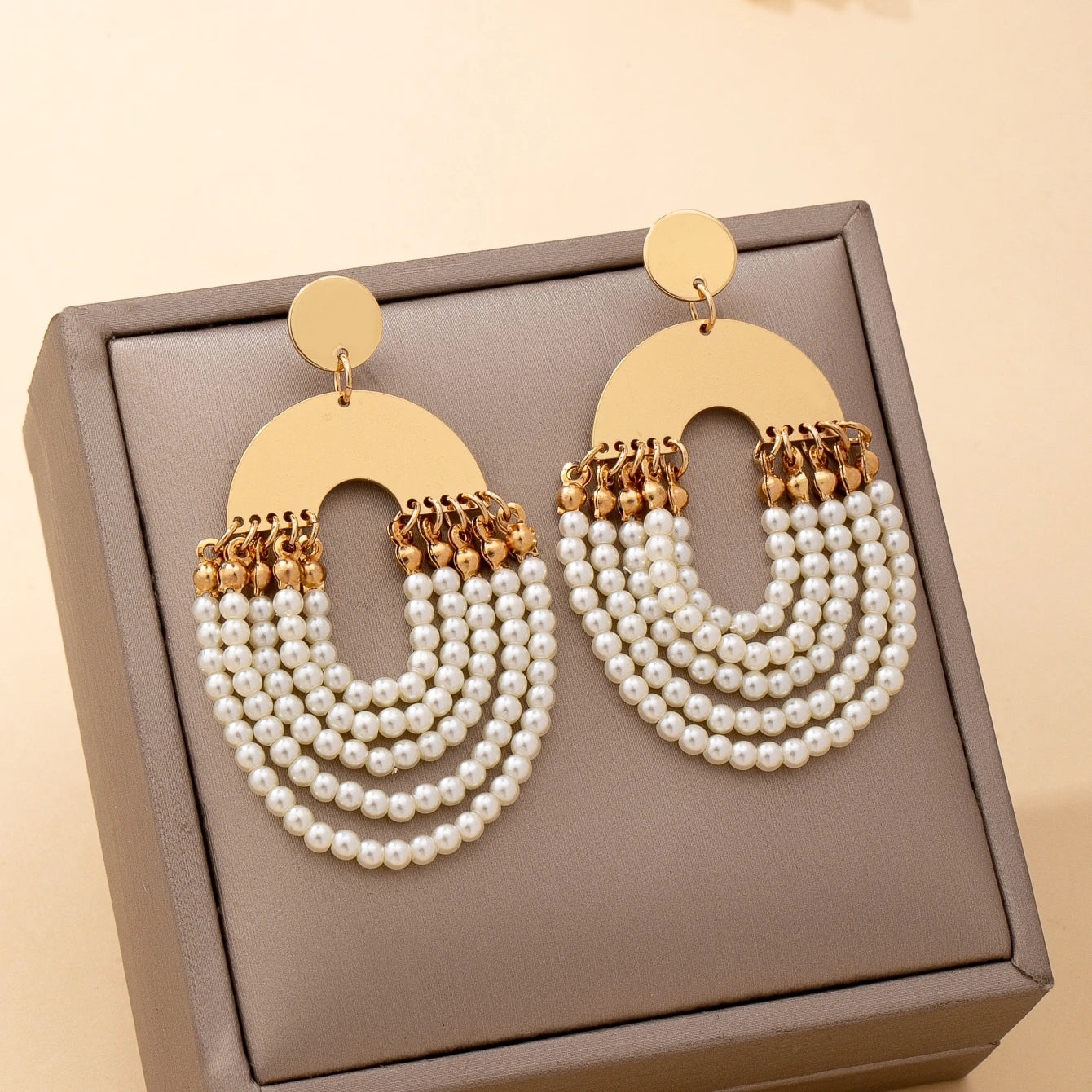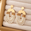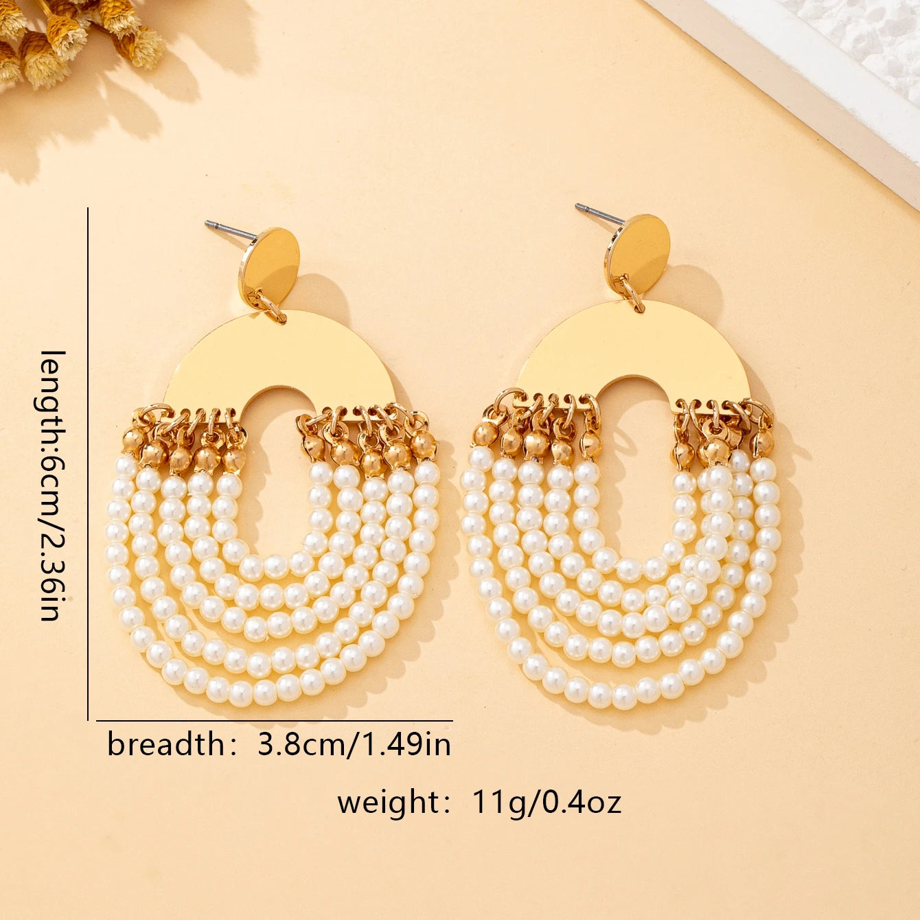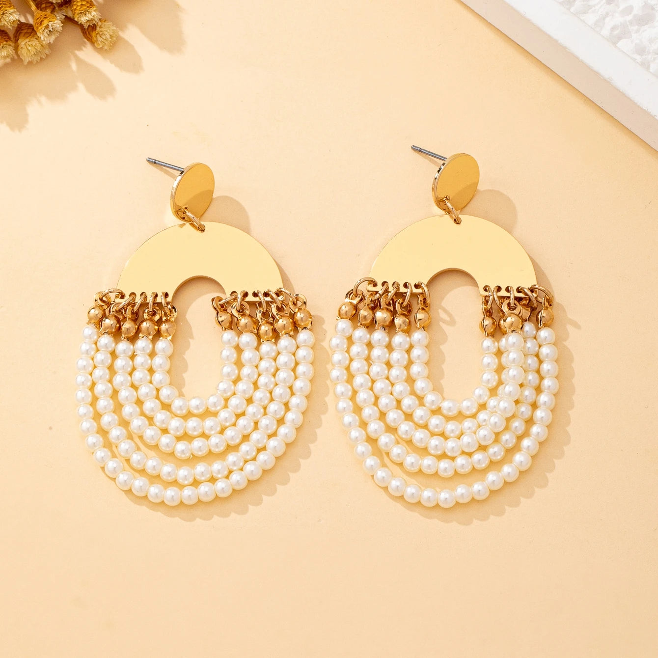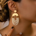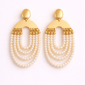 A bold statement shaped by balance and fluidity. These gold-tone earrings feature a sculptural semi-arch design anchored by a polished circular stud, enhanced with cascading strands of luminous pearls that create layered movement and soft dimension.