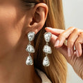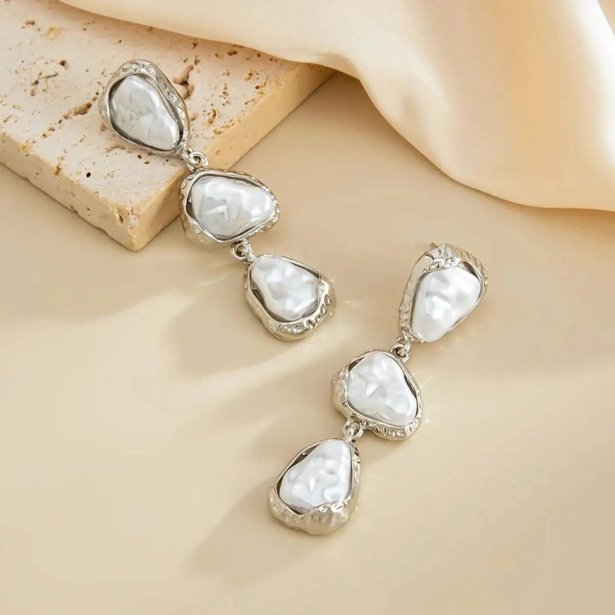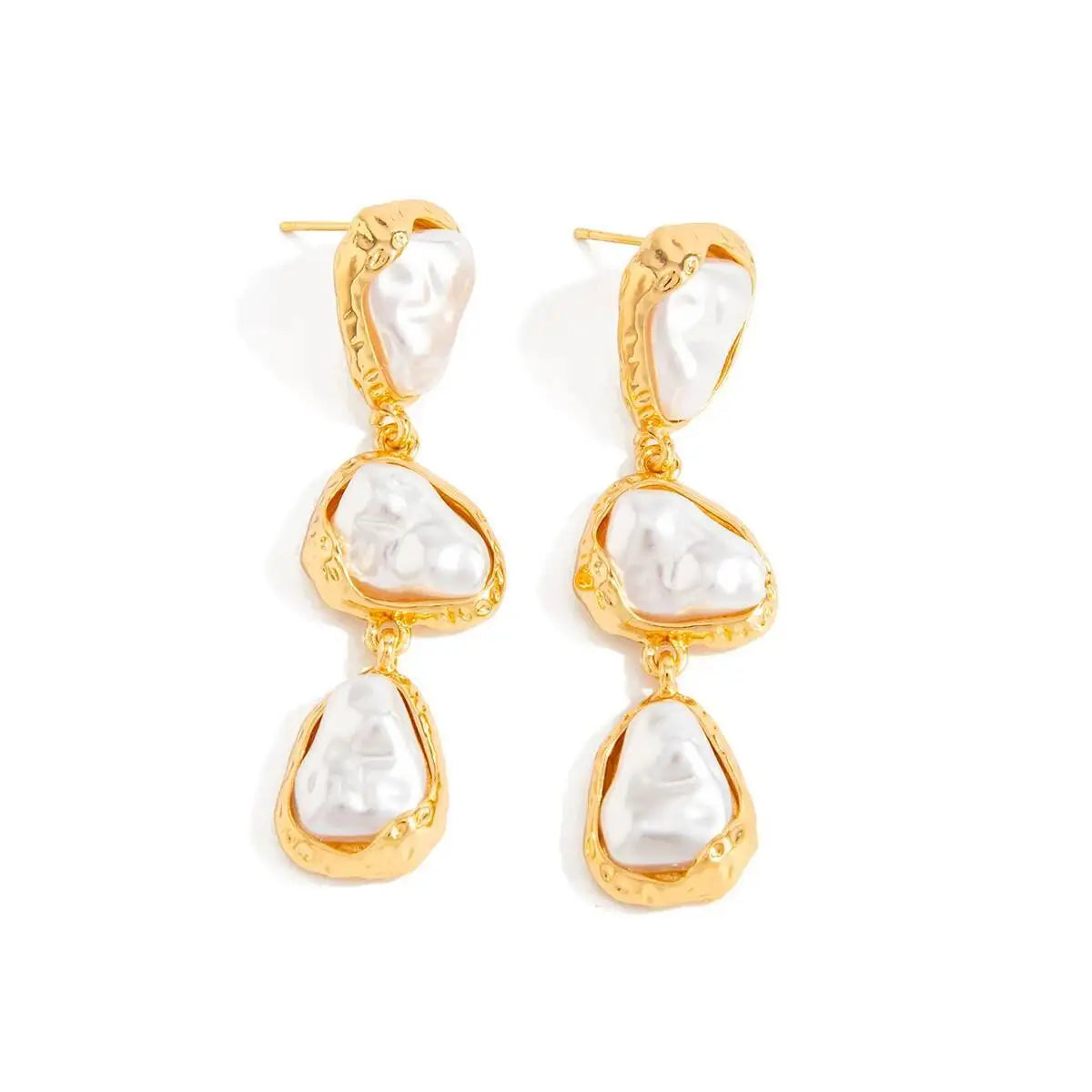 An expressive composition of organic elegance. These statement drop earrings feature three irregular pearl forms, each delicately framed by sculpted metal contours that enhance their natural character.