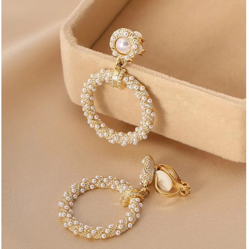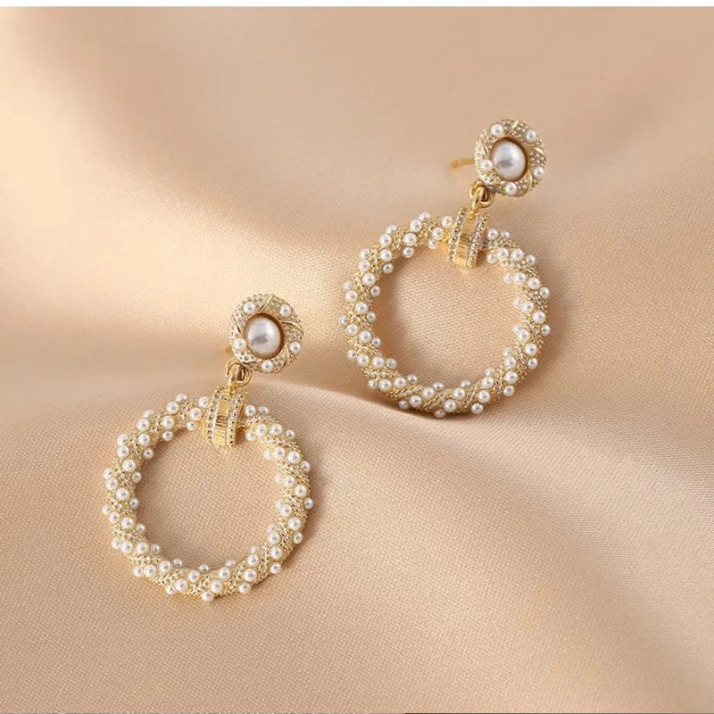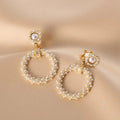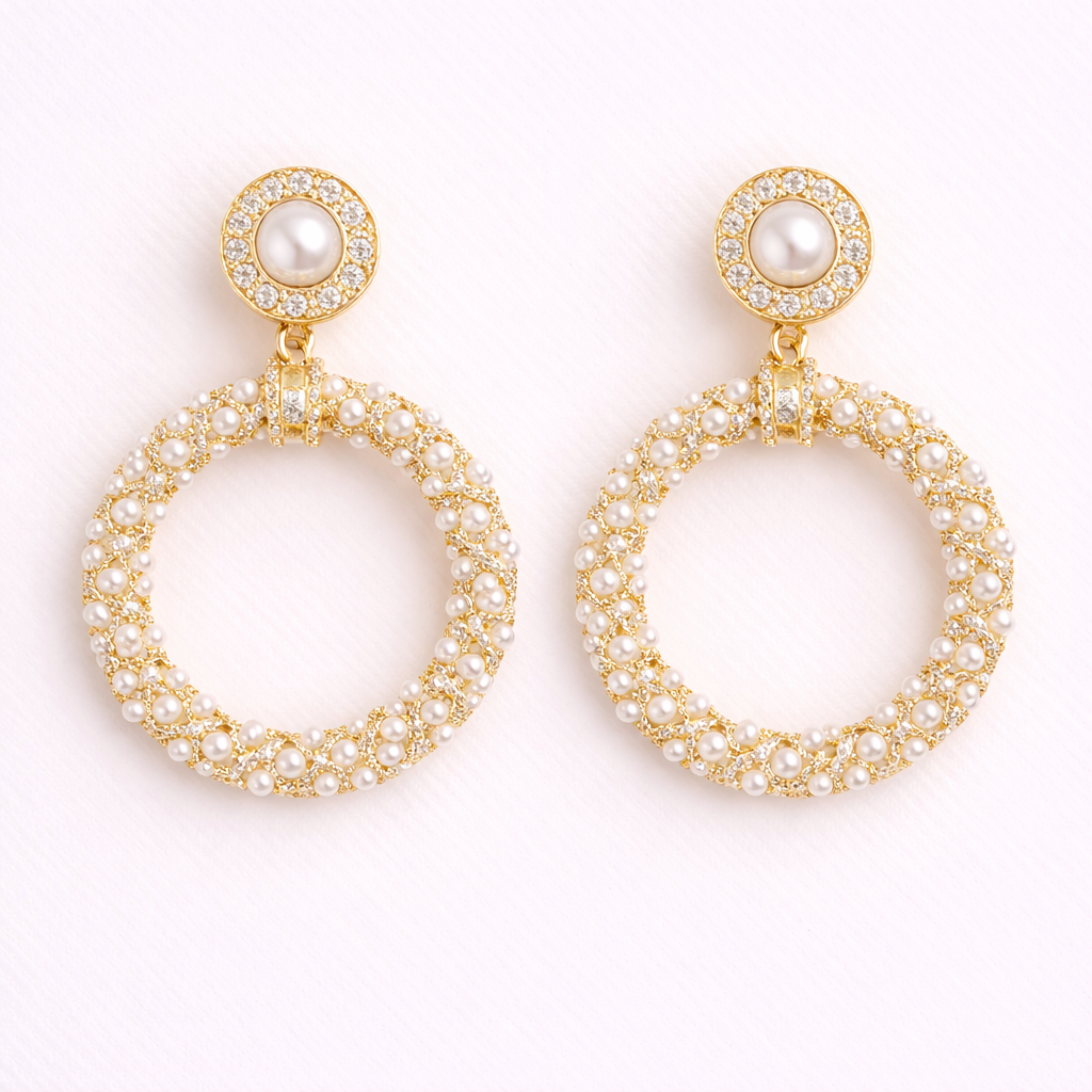 A refined fusion of vintage charm and sculptural elegance. These gold-tone earrings feature a textured floral stud adorned with delicate pearl accents, gracefully connected to a circular drop fully embellished with luminous micro pearls.