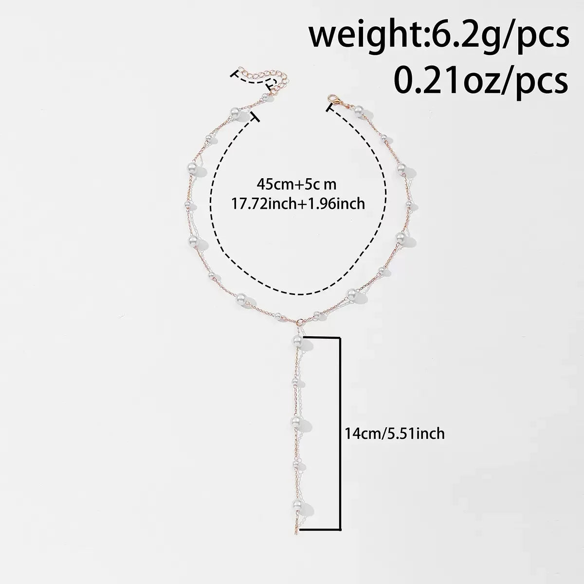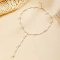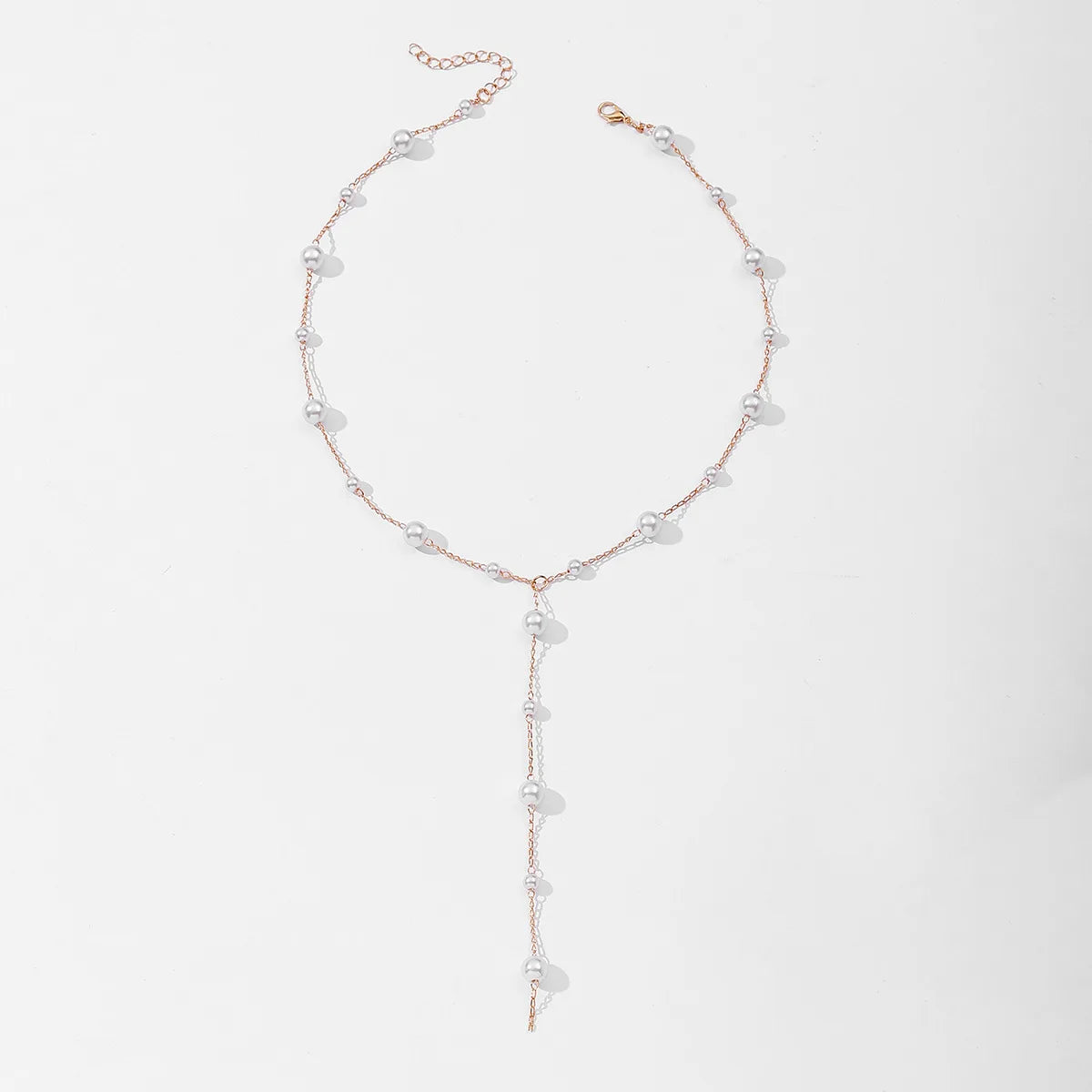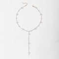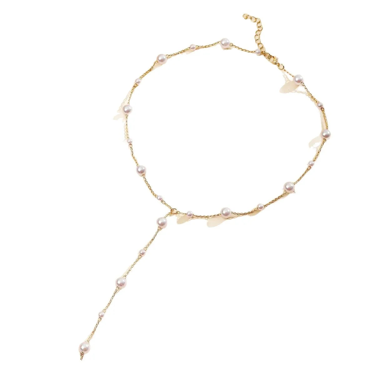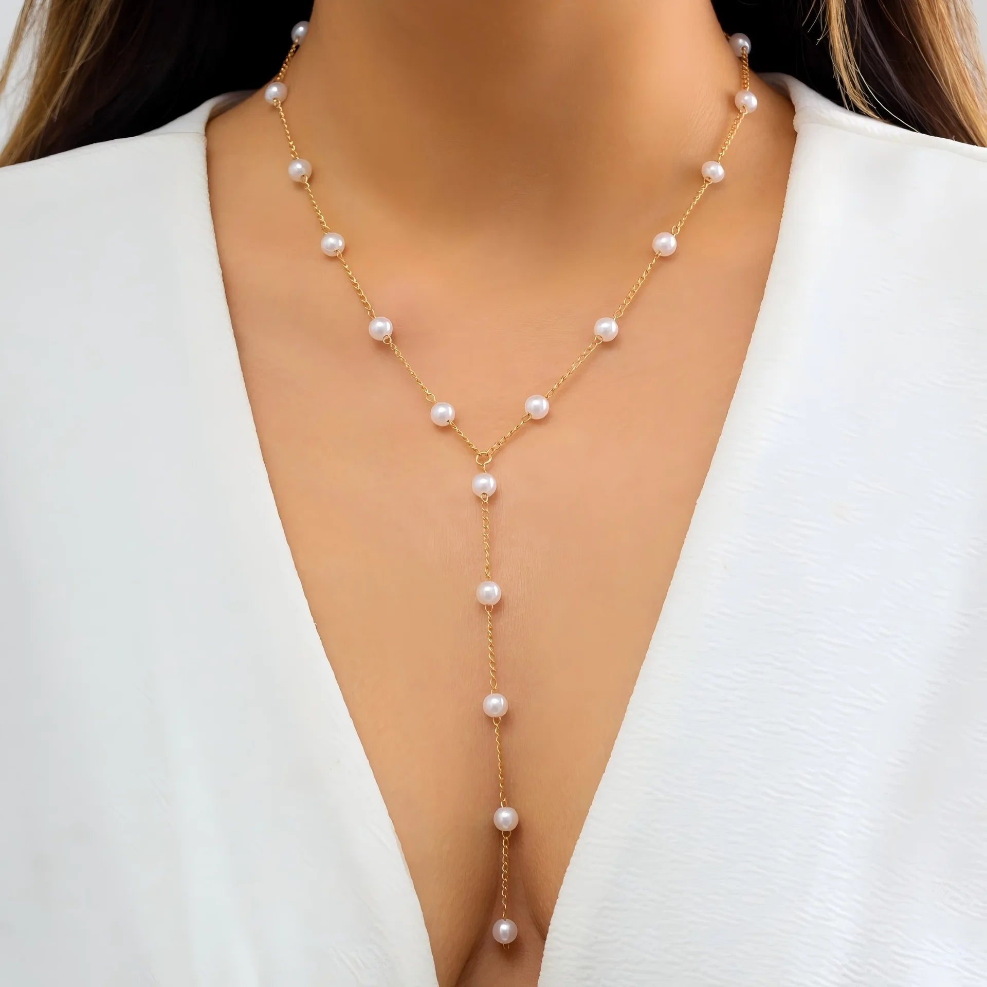 A delicate lariat-style necklace designed with luminous pearl accents placed along a refined chain silhouette. The vertical drop detail creates an elongated effect that enhances the neckline with subtle movement and understated elegance. Its minimalist structure balances softness and modernity, allowing the piece to transition effortlessly from everyday styling to elevated evening compositions.