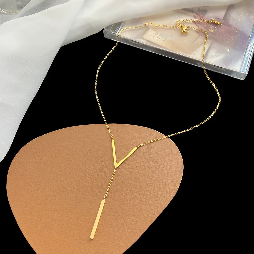 A modern lariat necklace defined by clean geometry and refined proportion. The structured V-shaped centerpiece frames the neckline with architectural precision, while a delicate vertical drop extends effortlessly, finishing with a sleek bar pendant. The design balances minimalism with presence, creating a strong yet elegant silhouette.