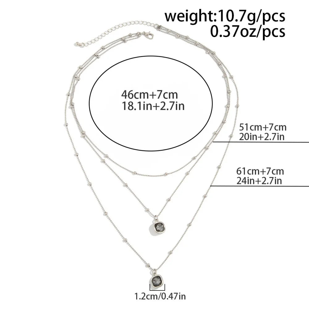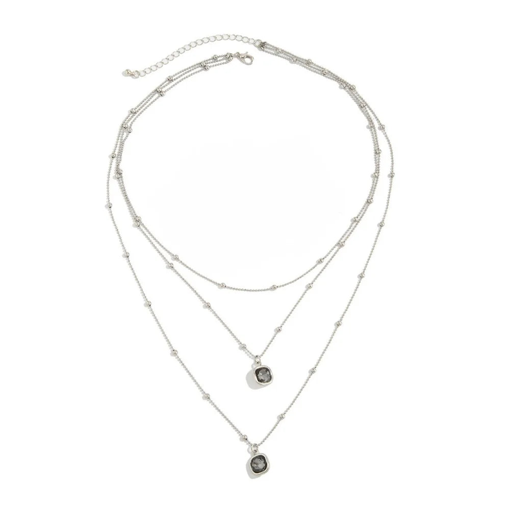 A layered necklace designed to create depth, movement, and quiet sophistication. Multiple fine silver chains fall in soft tiers along the neckline, accented with delicate metallic beads that add subtle texture. Two geometric pendants anchor the composition, each set with a deep-toned crystal that captures light with understated intensity.