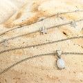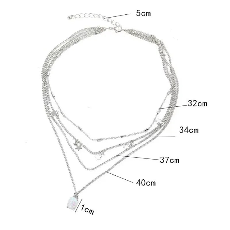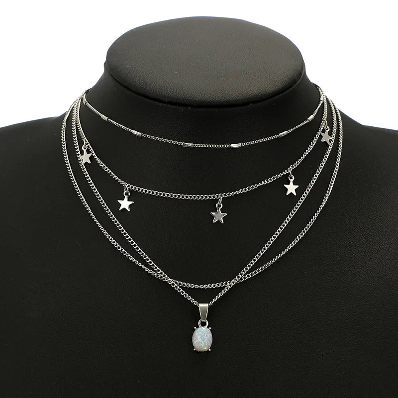 Detailing: Tiered chain structure with suspended star charms and oval-cut opalescent drop pendant