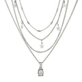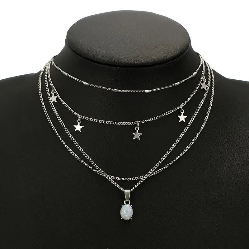 A celestial-inspired layered necklace designed to create depth and soft luminosity along the neckline. Composed of multiple fine silver chains, the piece features delicate star charms distributed across the upper layers, while a luminous oval pendant anchors the composition with subtle iridescent brilliance.