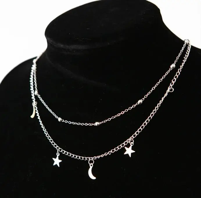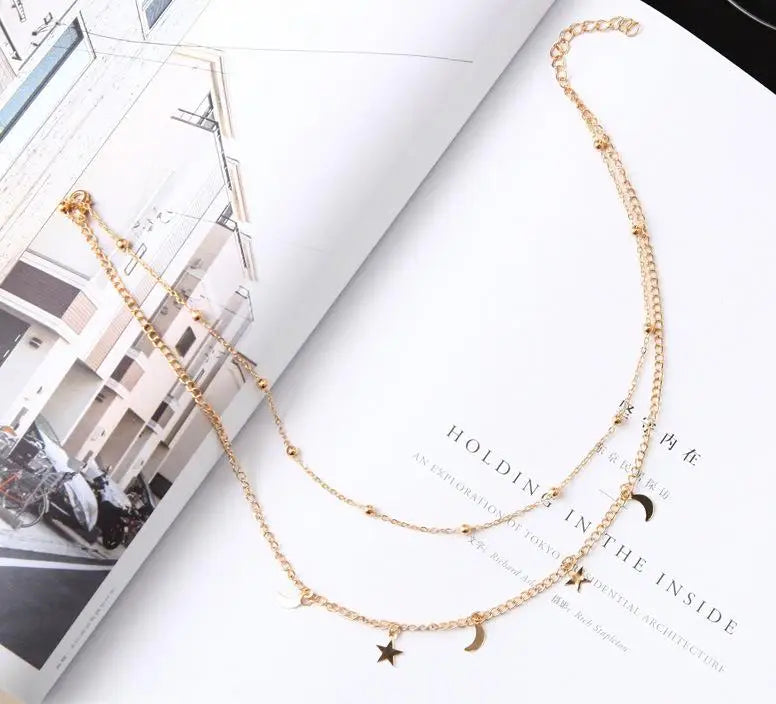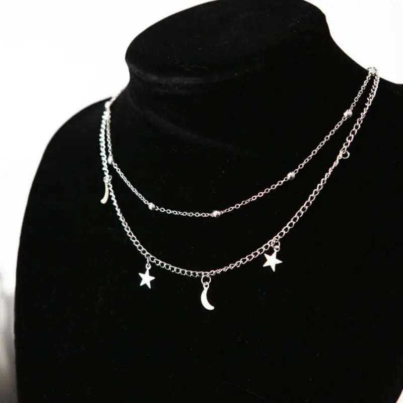 A delicate celestial composition designed to bring subtle radiance to everyday styling. This layered necklace features fine chains accented with polished beads and suspended star and crescent moon charms, creating a soft balance between minimalism and symbolism.