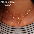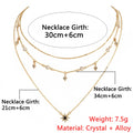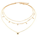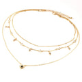 A refined layered choker designed to frame the neckline with delicate celestial brilliance. Composed of multiple fine gold chains, the piece features subtle crystal accents and suspended geometric drops that create soft movement and light reflection. The lowest layer is anchored by a radiant starburst pendant, set with a contrasting central stone that adds depth and definition.