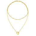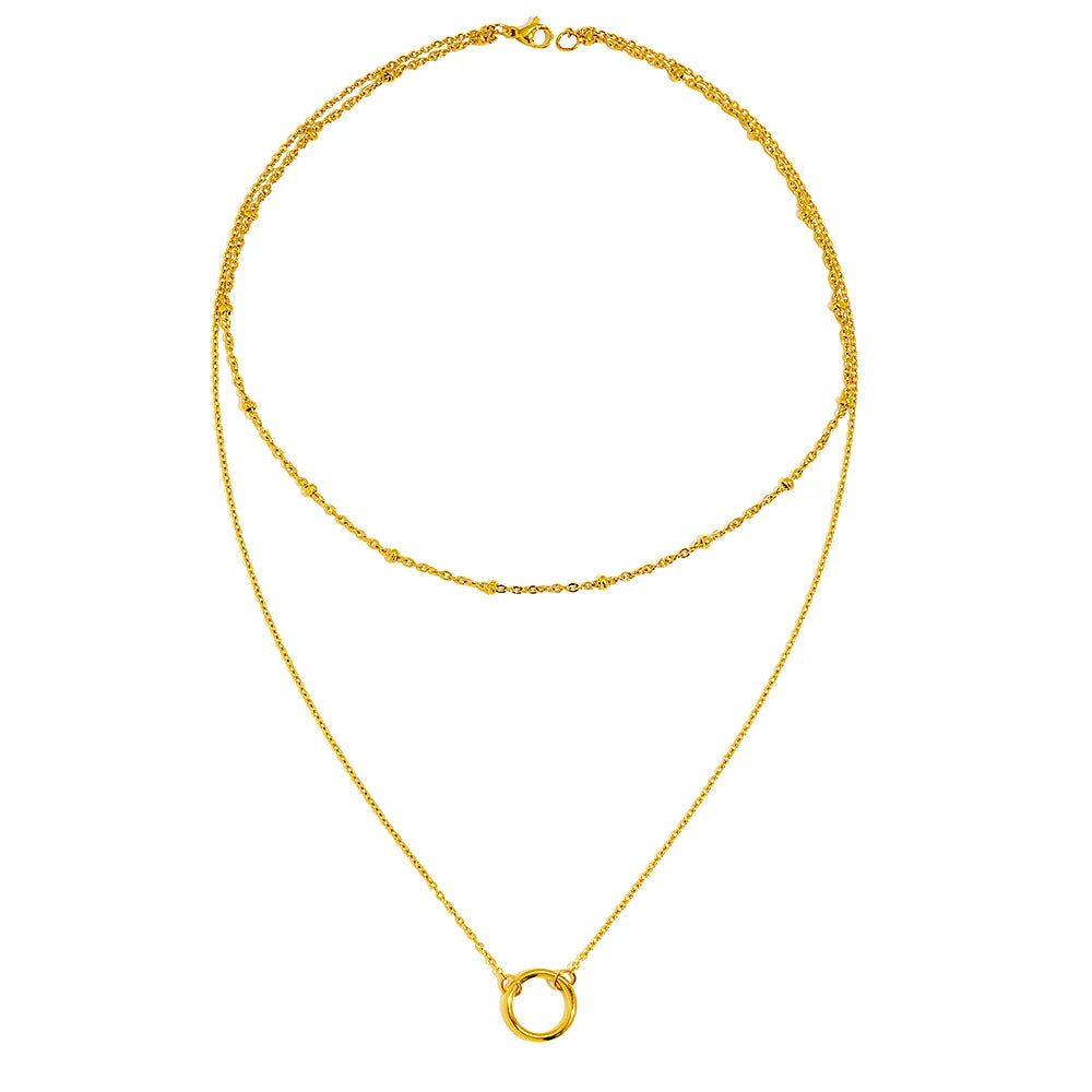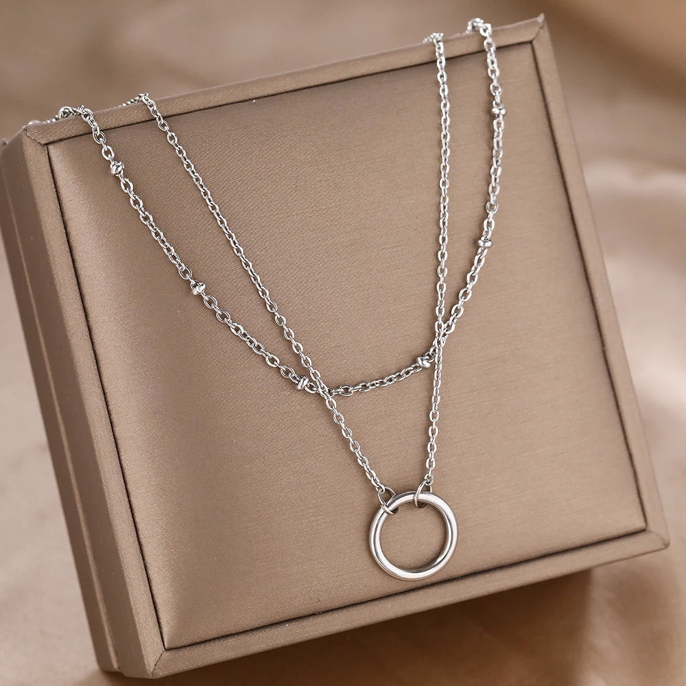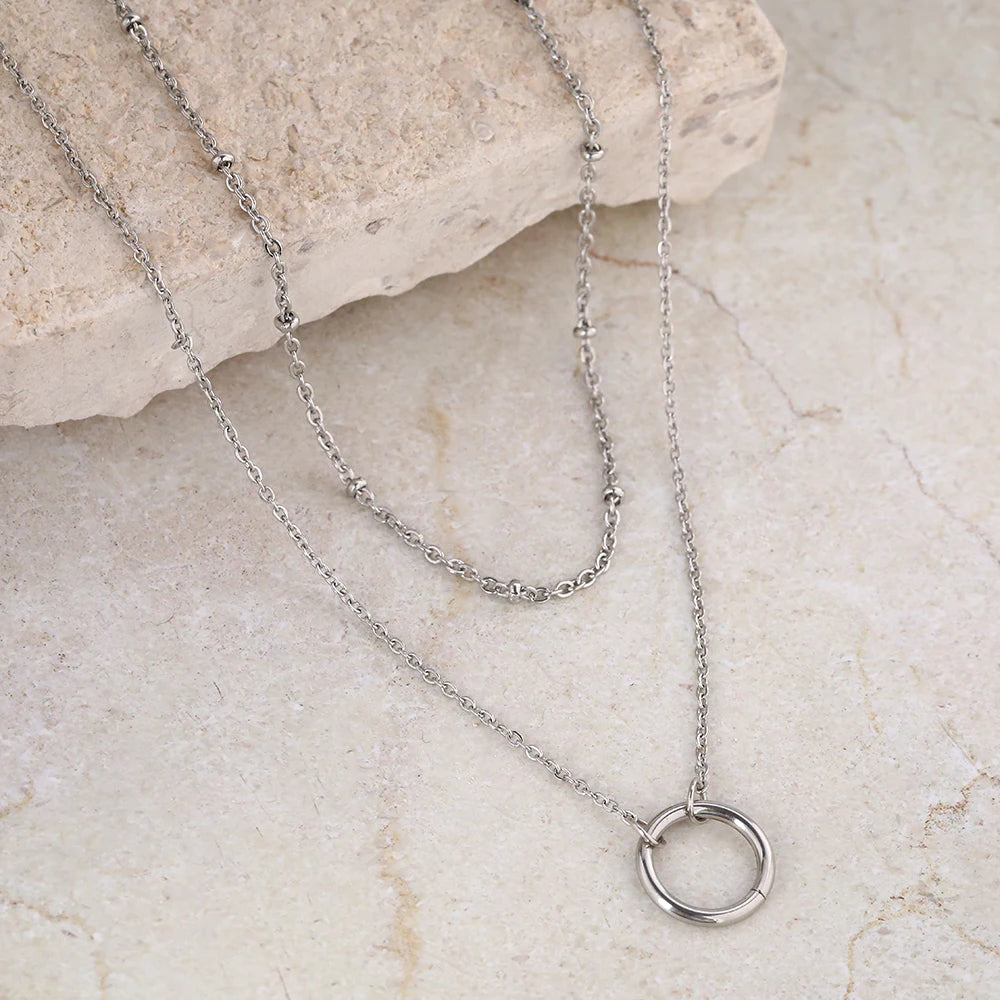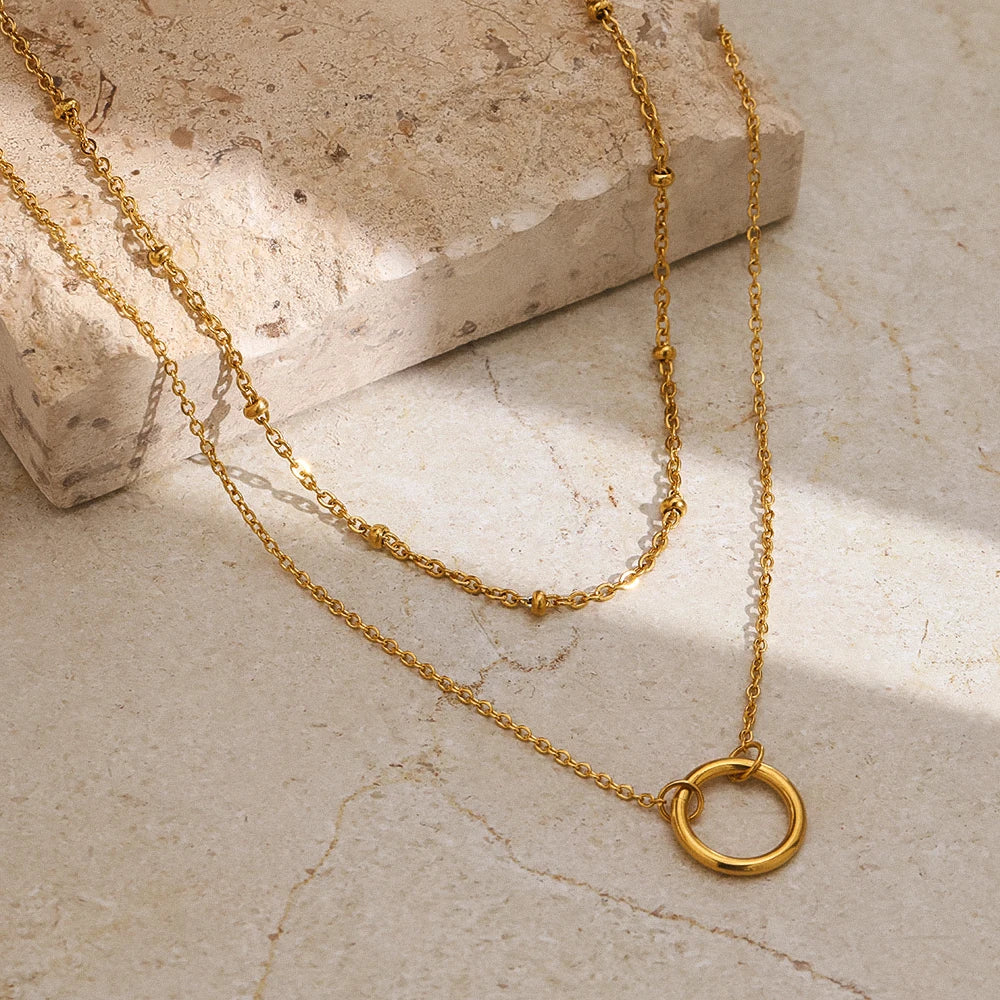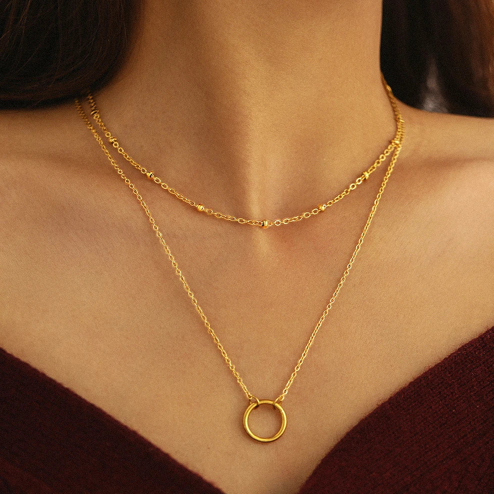 A refined layered design that blends modern minimalism with effortless elegance. This double-chain necklace features delicate golden accents and a sculptural circular pendant, creating a balanced silhouette that moves naturally with the neckline.